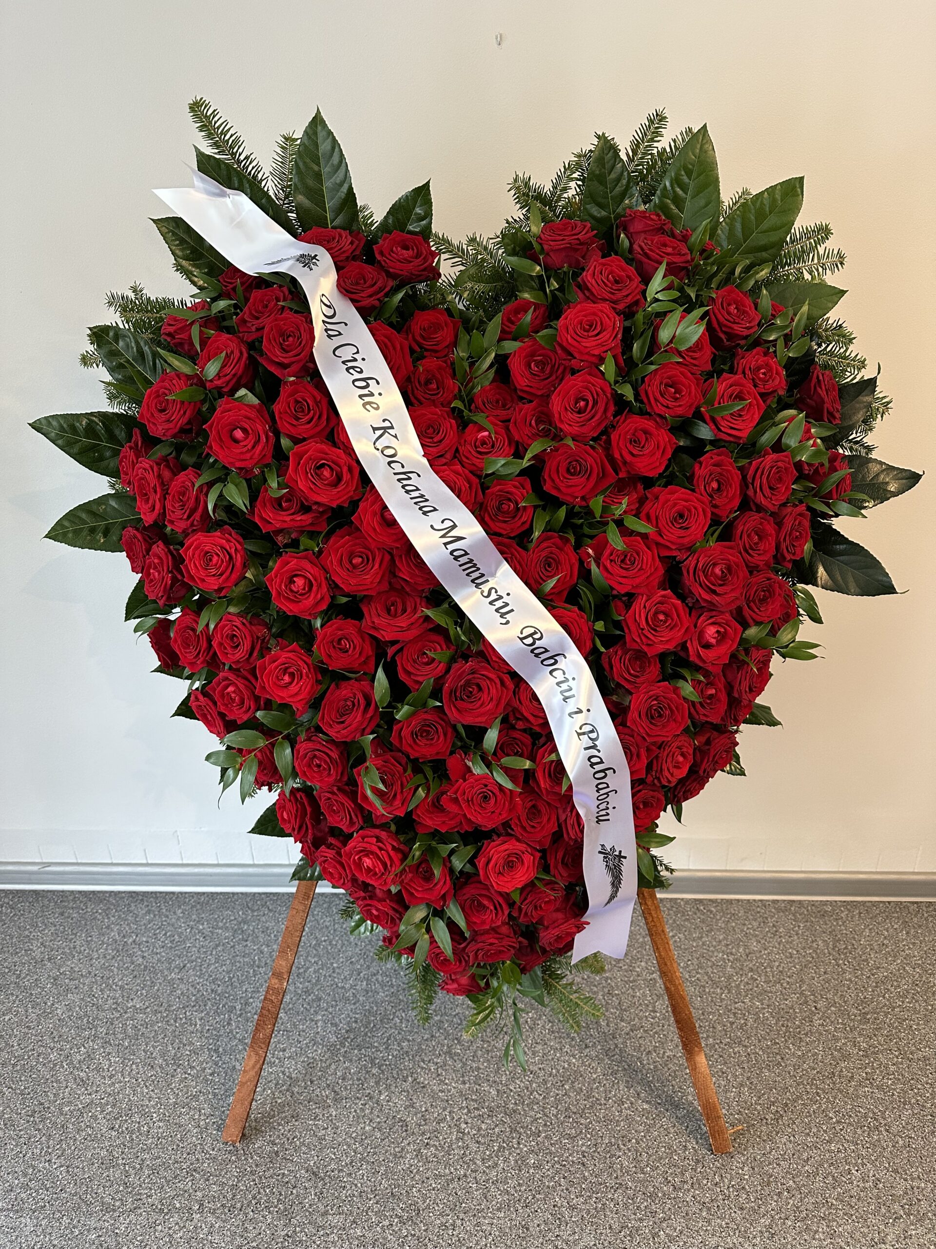 Wieniec w kształcie serca z czerwonych lub białych róż to nasza propozycja z dziedziny florystyki funeralnej. Jest to kompozycja niesamowicie dostojna i pełna emocji. Wykonujemy wieńce stojące lub kompozycje mocowane do aut towarzyszących w ostatniej drodze ziemskiej.